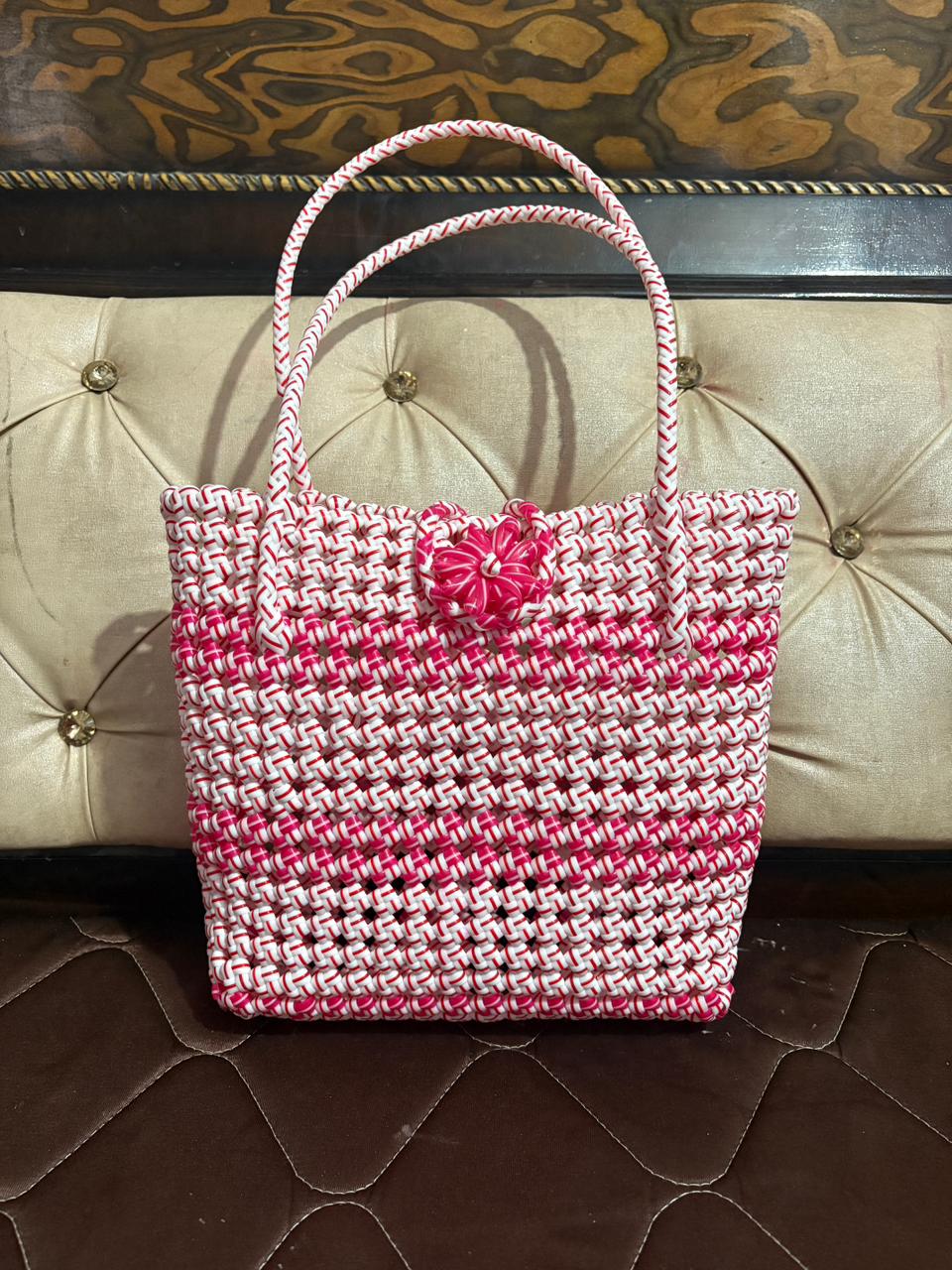 Handwoven Ladies Designer Plastic Bag ( Colour Pink & white )