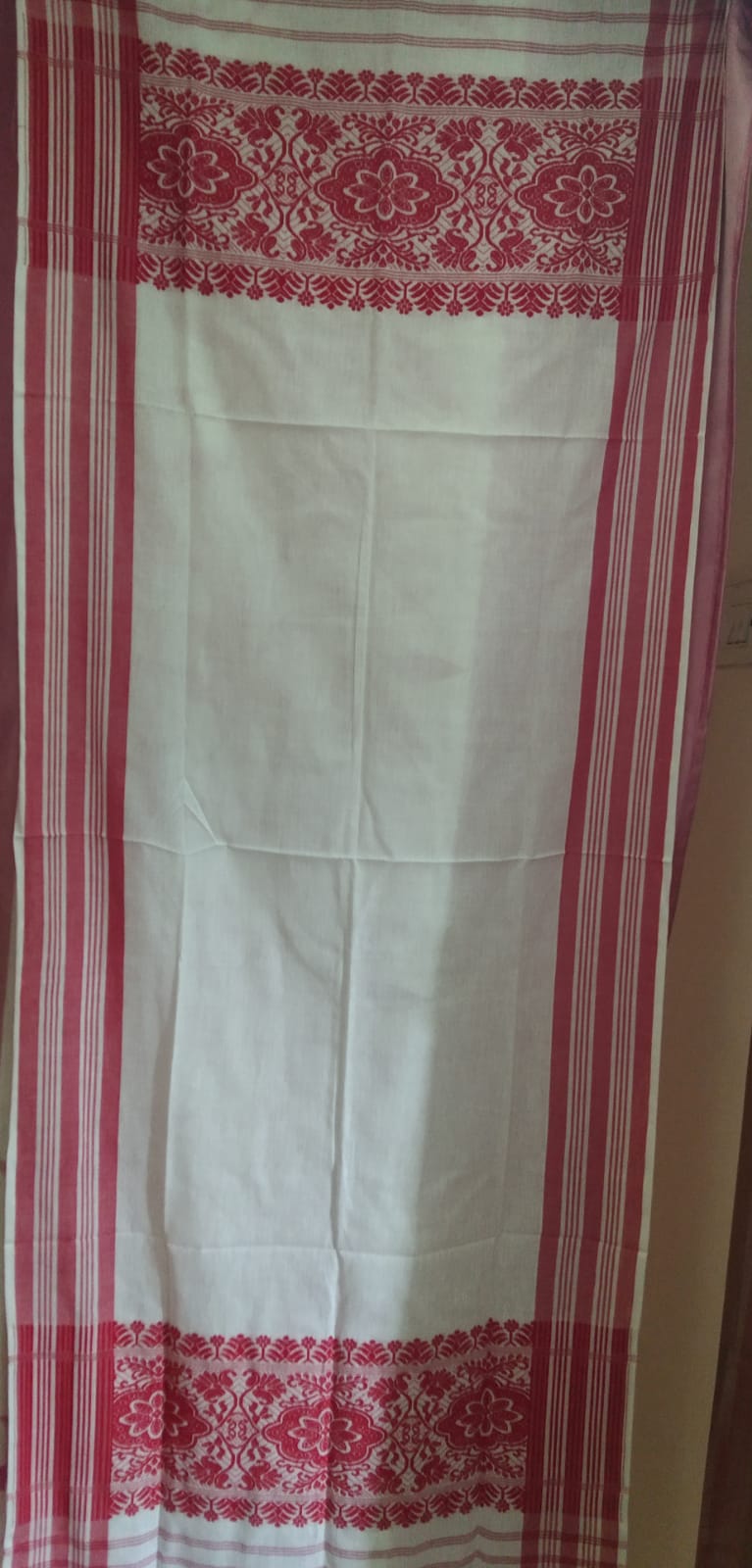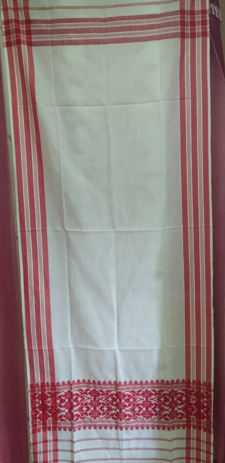 Celebrate Assamese tradition with this premium Machise Xuta Gamosa featuring traditional red motifs on a white base. Made from premium cotton yarn (Machise Xuta), this Gamosa is available in single pallu or double pallu full-work designs, perfect for cultural ceremonies and traditional gifting.